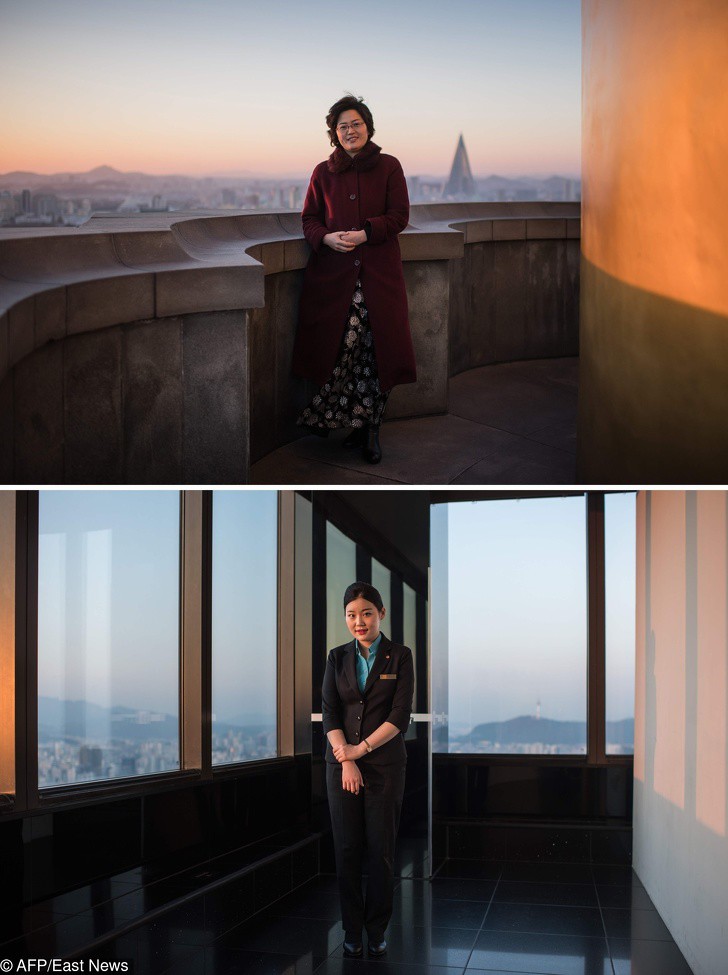 5. Đến một thành phố mới, ai mà chẳng muốn ngắm nhìn khung cảnh từ trên cao? Ví dụ như tòa Juche Tower ở Bình Nhưỡng và Tòa nhà 63 chọc trời - một trong những biểu tượng du lịch của Seoul. Đây là 2 nữ hướng dẫn viên tại 2 tòa tháp đó.