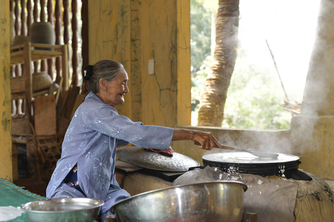 Không chỉ biết lái đò mà cụ Xong còn tráng mì rất thuần thục. Dù đã ở tuổi 80, cụ Xong vẫn hằng ngày tự lao động để kiếm sống và bà luôn nở nụ cười tươi trên môi. Chia sẻ về tấm ảnh mà nhiếp ảnh gia Réhahn Croquevielle chụp mình, bà Xong cho hay đó là khoảnh khắc bà ngại ngần khi thấy ống kính máy ảnh đang hướng về phía mình nên bà đã đưa tay che mặt.