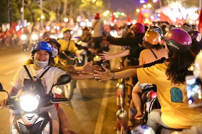 Cổ động viên đập tay ăn mừng trên đường Tôn Đức Thắng quận 1, TP.HCM. Ảnh: HOÀNG GIANG