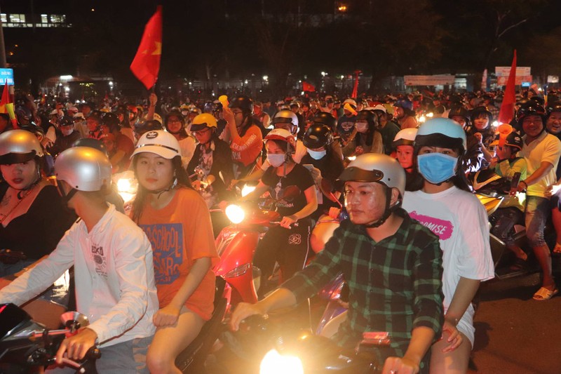 Khu vực trung tâm quận 1, TP.HCM như sáng bừng lên với các cổ động viên. . Ảnh: HOÀNG GIANG