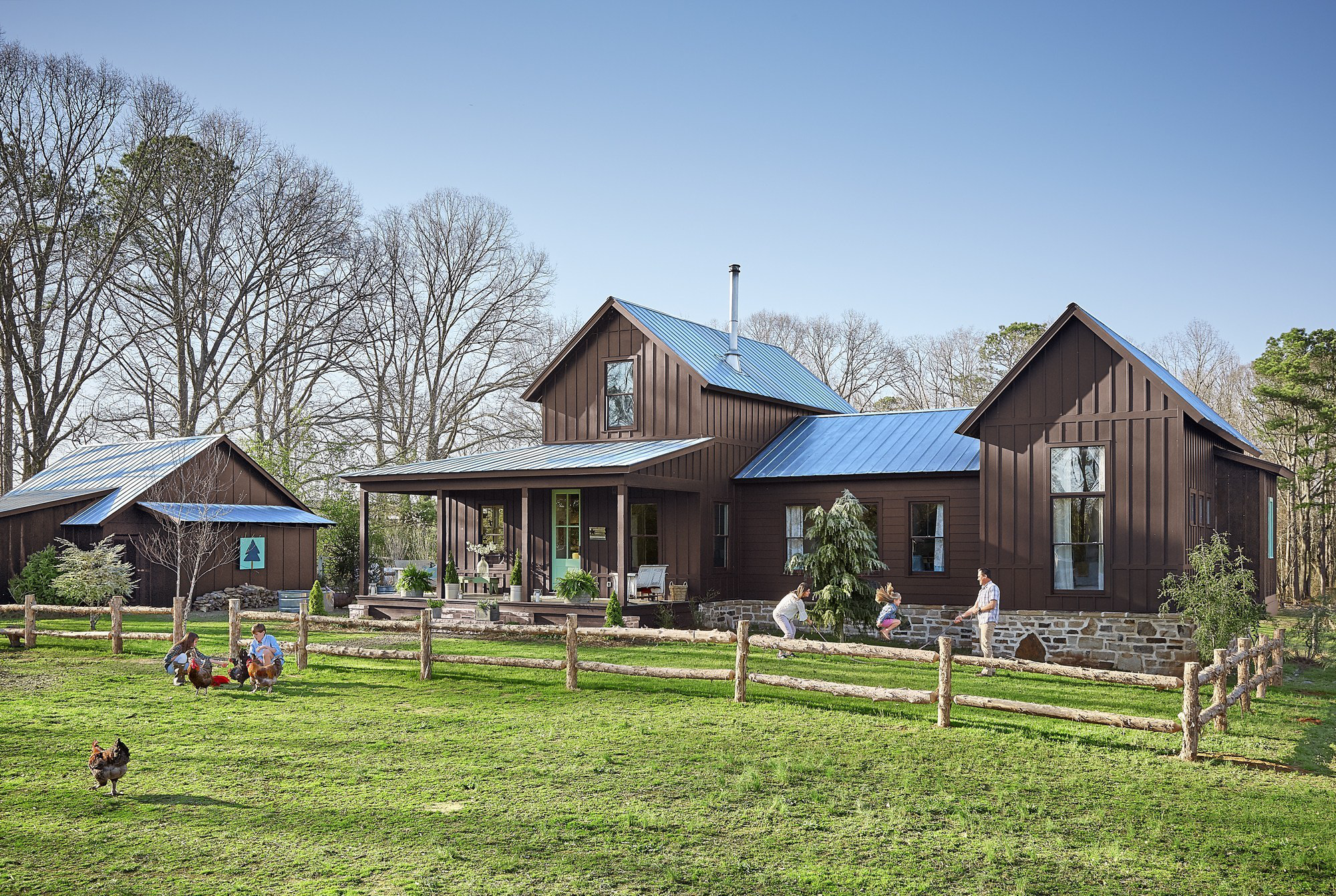 Ngôi nhà tọa lạc trên một vùng đất yên bình với những thảm cỏ xanh mướt mát.