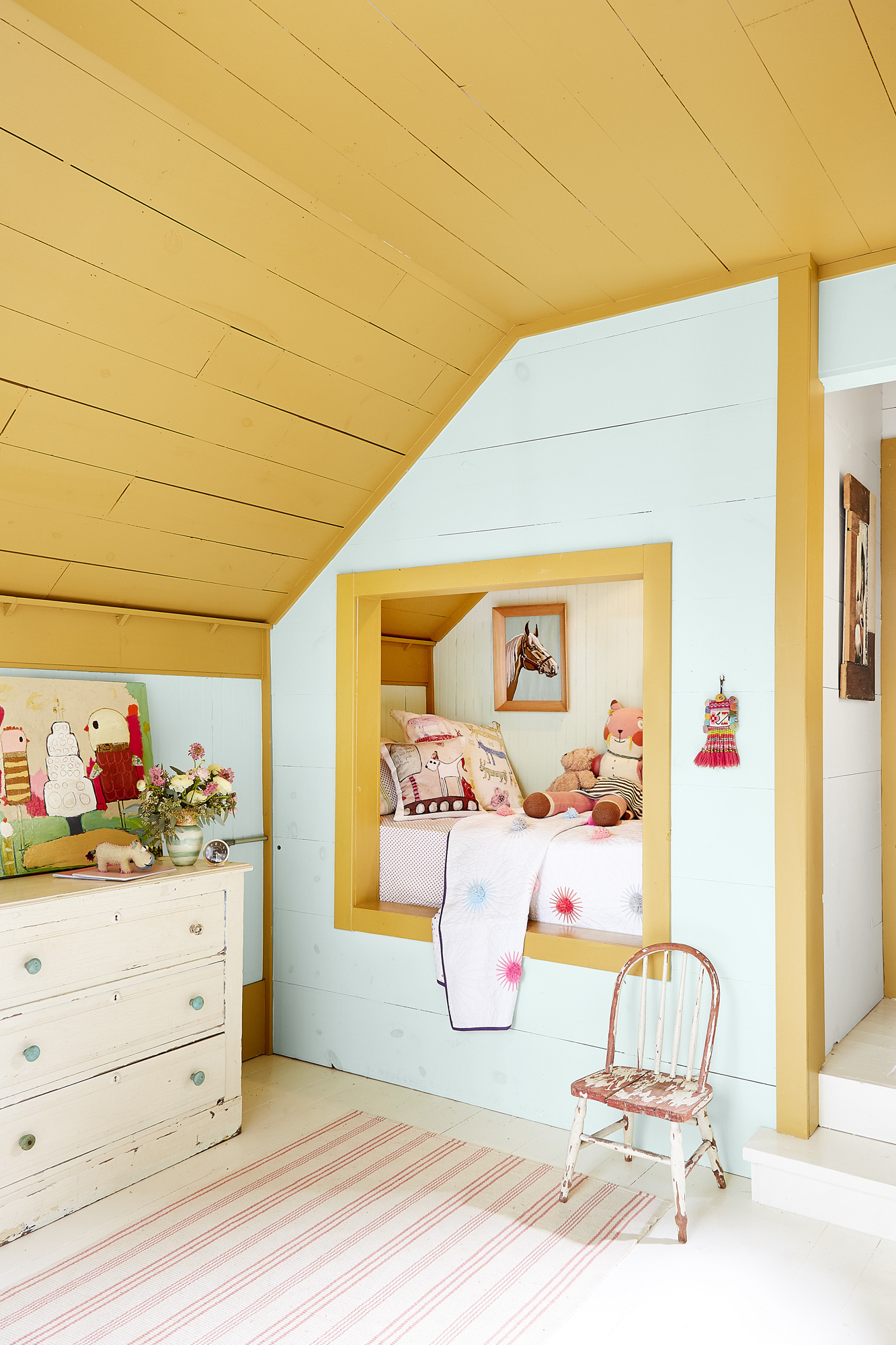 Ngược lại, trong phòng của cô con gái điệu đà, màu sắc tươi sáng, mộng mơ hơn được tận dụng tối đa dành cho những em bé còn tuổi chơi búp bê.