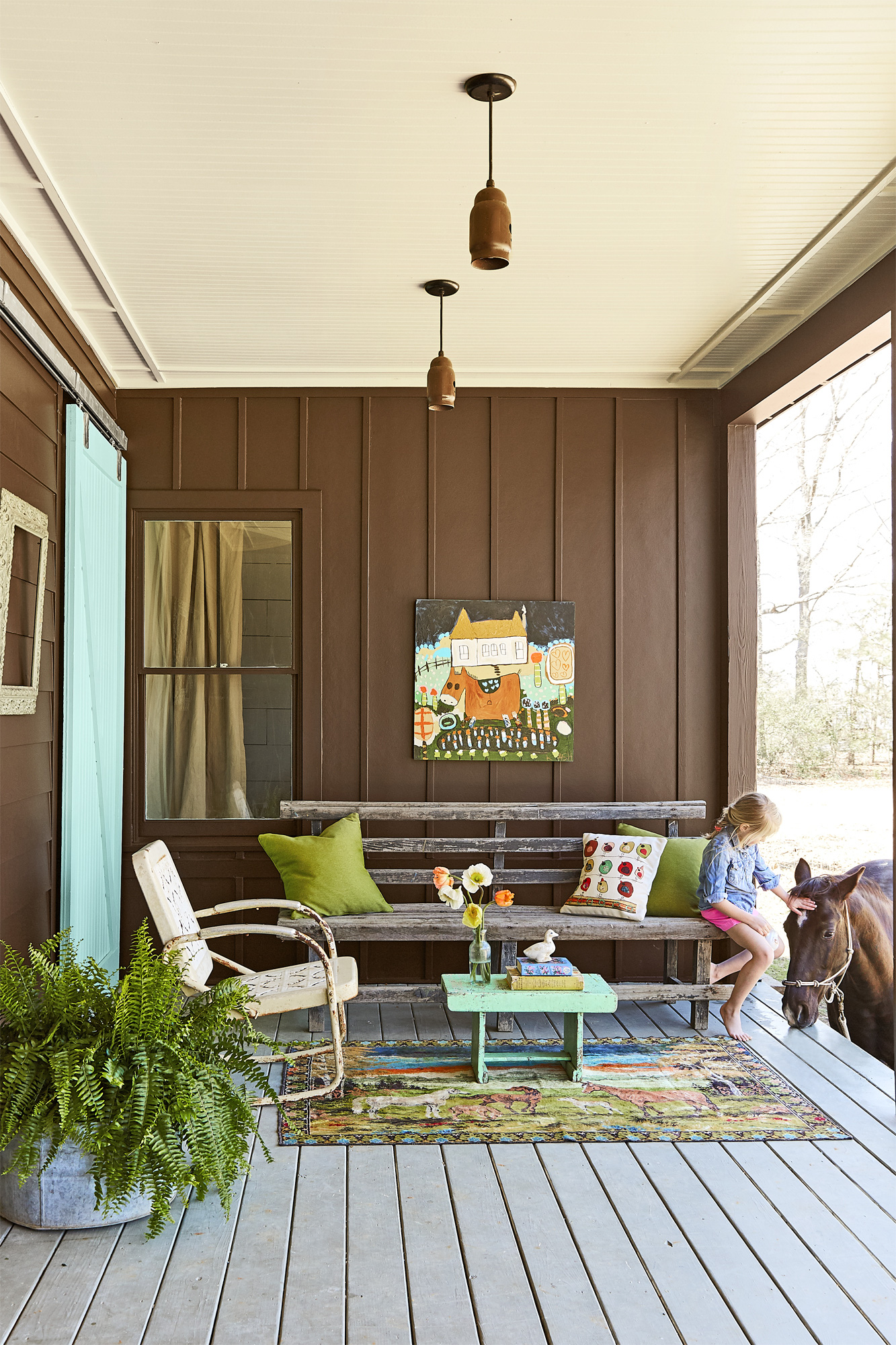 Một góc hiên nhà được trang trí giản đơn nhưng cực xinh xắn làm chỗ ngồi chơi cho các con.