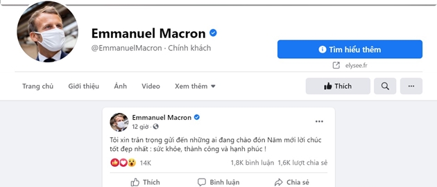 Đến 21h30' ngày 12/2, hơn 13 giờ sau khi gửi lời chúc mừng năm mới trên mạng xã hội bằng tiếng Việt, lời chúc của Tổng thống Pháp Macron đã nhận được hơn 15.000 lượt thích, hơn 3.500 lượt bình luận và chia sẻ.
