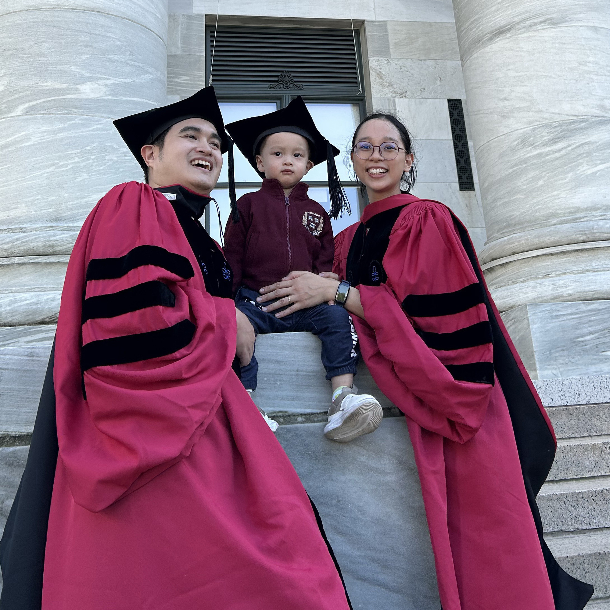 Hai vợ chồng Bùi Phương Linh, Phạm Thanh Tùng cùng con trong ngày tốt nghiệp tiến sĩ Đại học Harvard (Mỹ) - Ảnh: NVCC